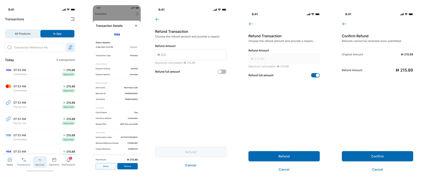 Failure: “Refund failed. Please try again later.” - Refunded transactions show as Refunded.
