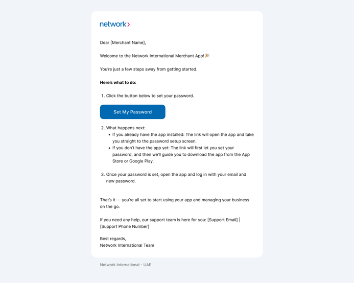 Once onboarding is complete, you’ll receive a welcome email from Network International.