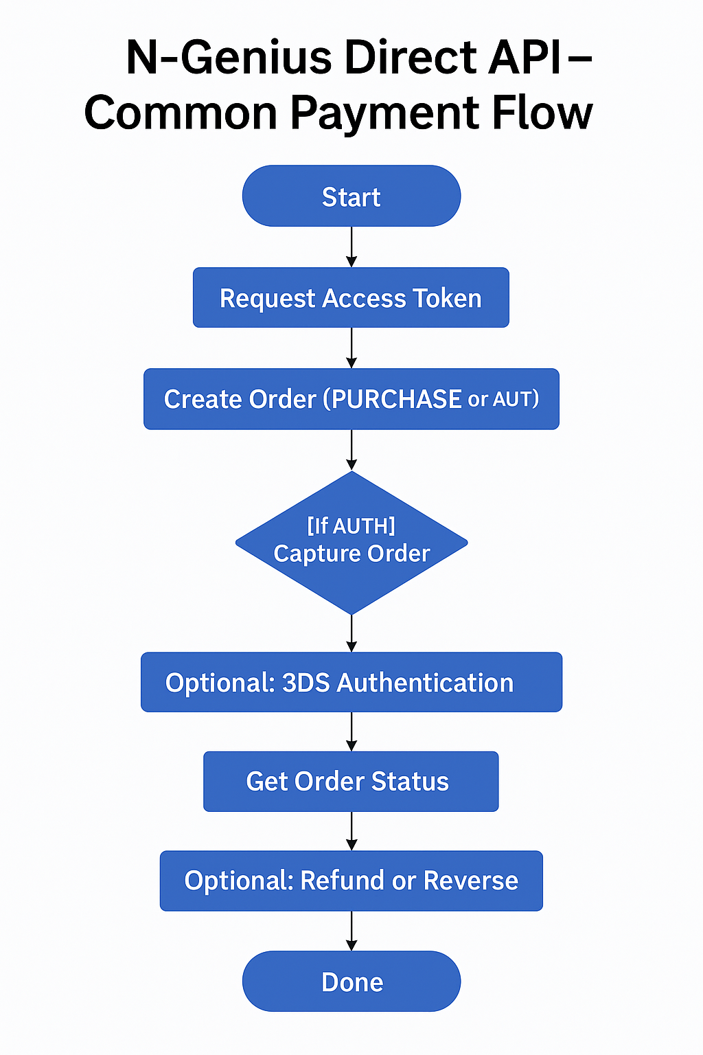 N-Genius Direct API Flow – From authentication to refunds, this flowchart outlines the typical integration journey for merchants seeking full control over their checkout experience.
